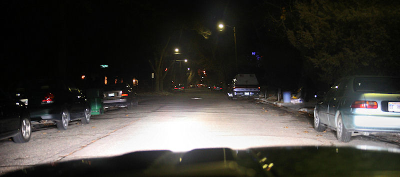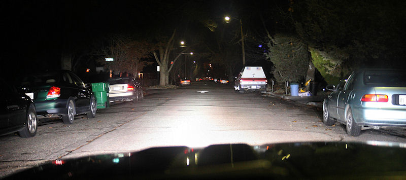 Residential street on dip-beam. Note that there is enough "spill" to illuminate the reflective street sign on the left.